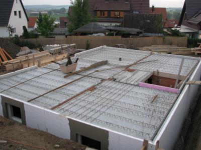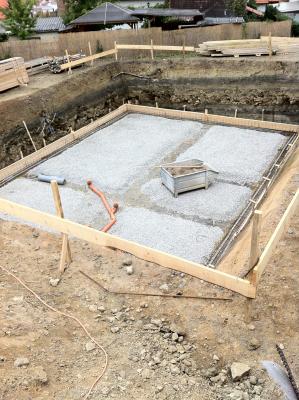 Kellerboden wrid aufgeschüttet. Der Kies zeigt, wo die einzelnen Räume später entstehen.